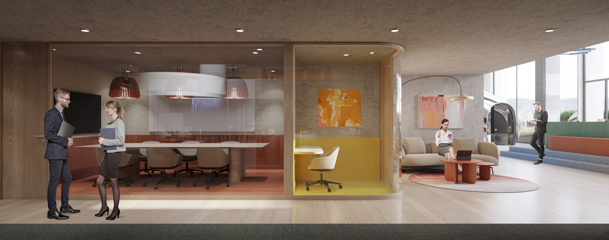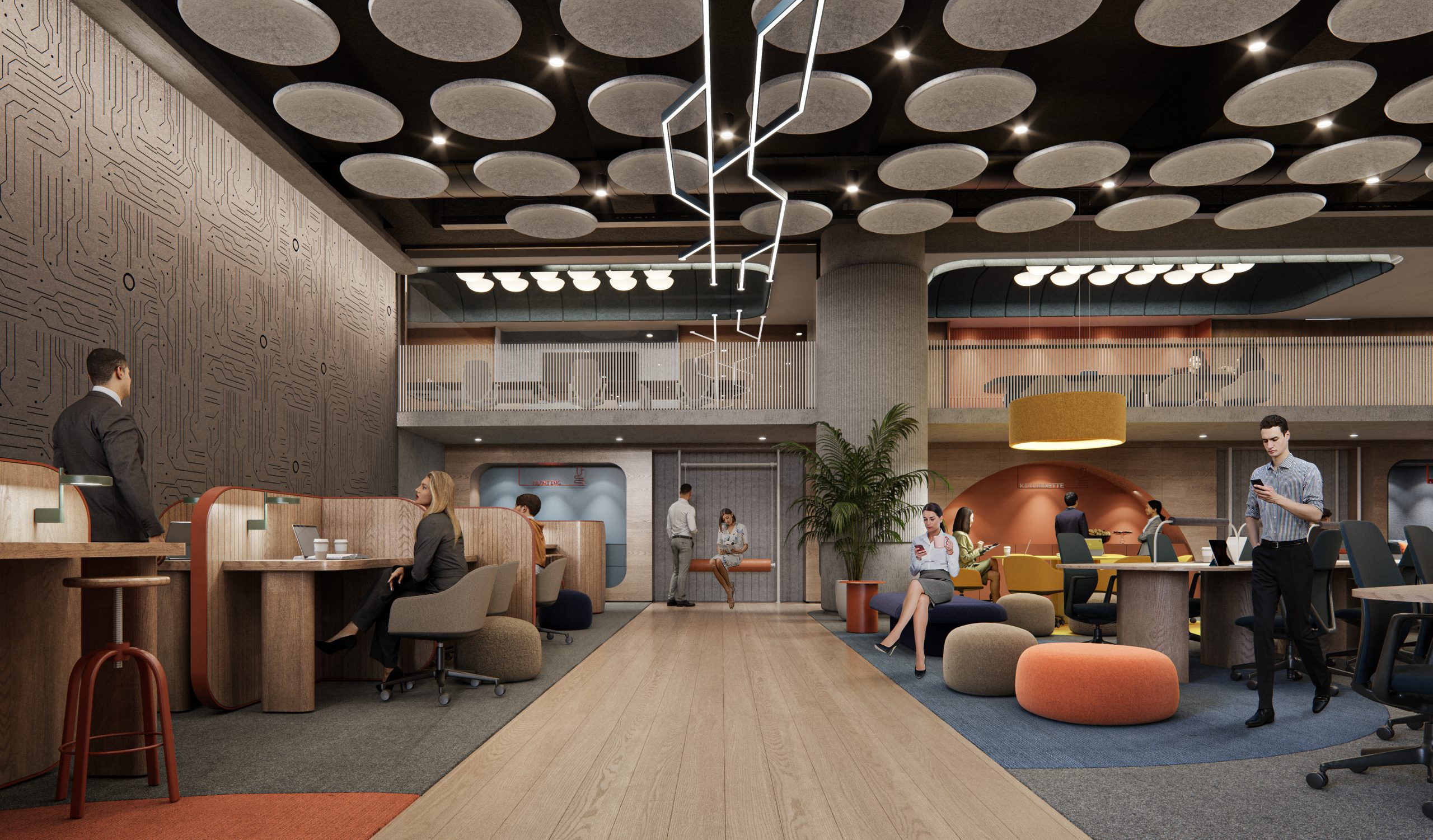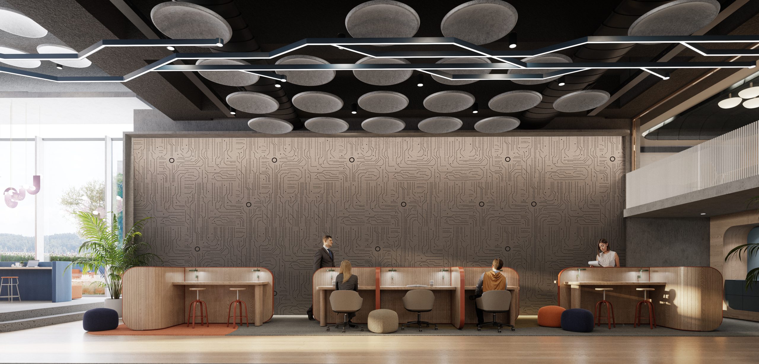 This project by Habif Architects is designed to support the evolving dynamics of modern work and learning environments. A central amphitheater anchors the space as a hub for presentations and collective engagement, while surrounding work zones offer quiet, focused areas for individual tasks. Acoustic ceiling elements enhance spatial comfort, while the use of color and texture fosters a warm and dynamic atmosphere. The interior design reflects the institution’s identity while promoting a flexible, user-centric ecosystem for productivity and collaboration.