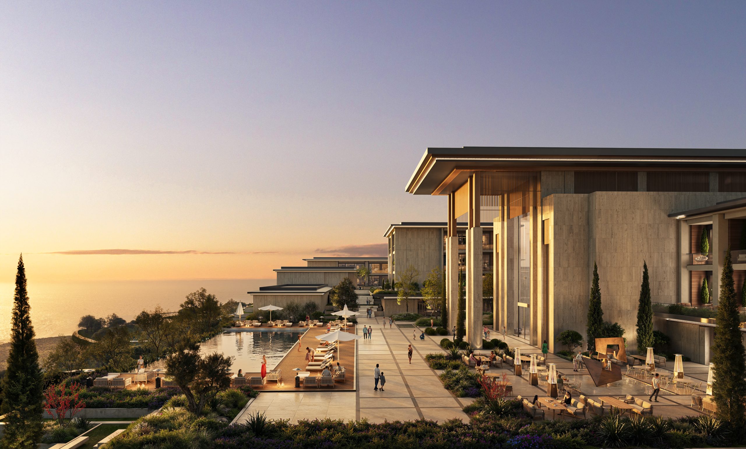 Designed by Studio Vertebra, this coastal development in Baku brings together a luxurious hotel, serene villas, and vibrant communal areas to form a harmonious living environment.